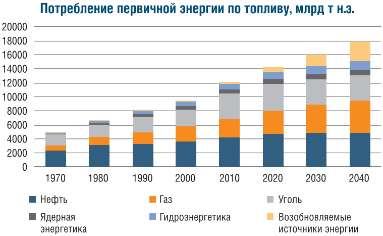 Рисунок 1.1 - Изменение мирового потребления первичной энергии по топливам