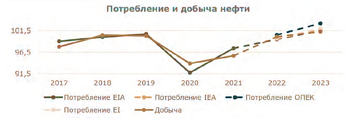 2023 году прогнозируется восстановление добычи до 101,3 млн баррелей/сутки. Прогнозы относительно потребления в следующем году варьируются от 101,5 (EIA) до 103,2 (ОПЕК) млн баррелей/сутки (рис. 1.3).