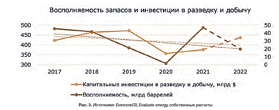 Выполняемость запасов относительно добычи за последние пять лет составила 43%. Открытие новых запасов приводится на примере 119 компаний (20% мировой добычи). 75% от объема открытий приходятся на шельф.