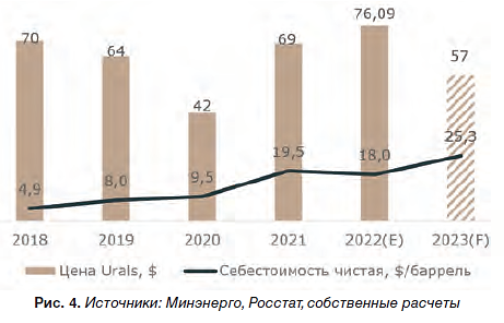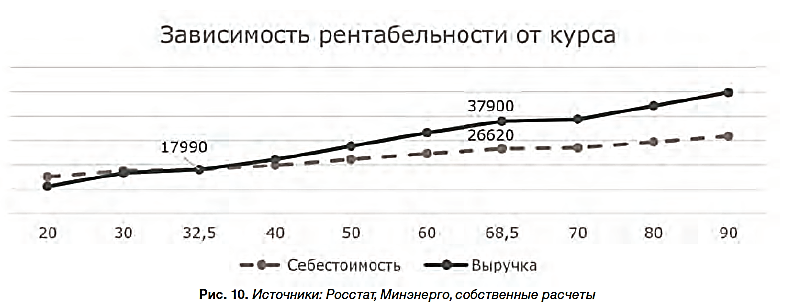 Укрепление рубля является ключевым негативным фактором, сдерживающим отрасль от рекордной рентабельности в 2022 году. С учетом текущей полной себестоимости критическим является курс 33 руб./$ (при цене Urals 76$), такой курс приведет отрасль к убыточности экспорта (рис. 1.11). С учетом того, что на экспорт приходится 80 % выручки ВИНК и почти вся их рентабельность, даже небольшие колебания будут серьезно отражаться на годовом результате компаний и бюджете страны.