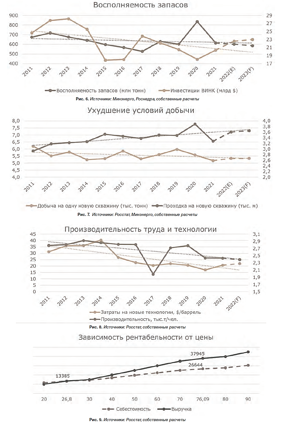 Себестоимость добычи нефти растет в основном за счет ухудшения условий добычи, и эта тенденция имеет долгосрочный характер (рис. 1.5). Его дополнительно поддерживает общий рост себестоимости коммодити-бизнеса в РФ из-за локальных темпов инфляции, старения и оттока населения из малых городов, а также отставания от западных компаний по уровню инвестиций в технологическое развитие.