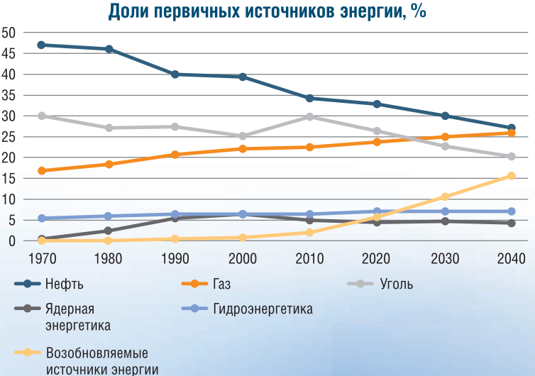 Рисунок 1.2 - Изменение доли первичных источников энергии в мировом потреблении