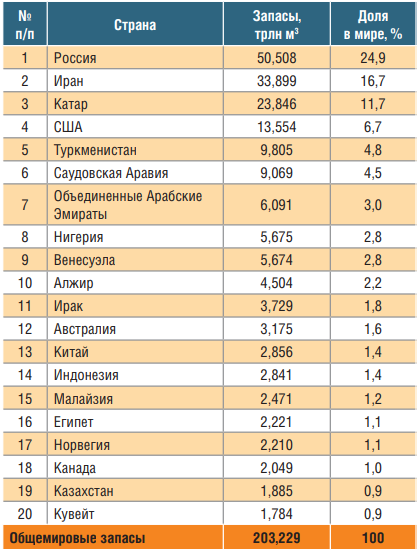 По ресурсам газа, с большим отрывом от других стран мира, лидируют Россия (50,508 трлн м3), Иран (32,899 трлн м3) и Катар (23,846 трлн м3).