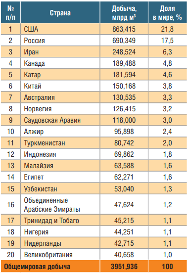 По объемам добычи газа в мире в настоящее время со значительным отрывом от других газодобывающих стран лидируют США (863,415 млн м3) и Россия (690,349 млн м3). Большими объемами природный газ добывается в Иране, Канаде, Китае, Катаре, Австралии, Норвегии и Саудовской Аравии.