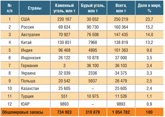Мировые промышленно-извлекаемыми запасами углей оценивается в 1054,782 млрд т, большей частью которых обладают США, Россия, Австралия, Китай и Индия. Крупными ресурсами углей также обладают Германия, Украина, Казахстан, Польша и Индонезия.