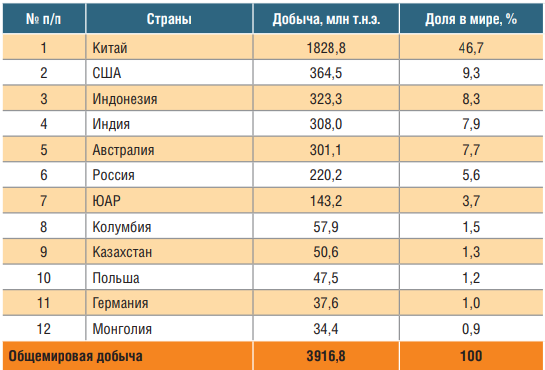 Таблица 1.6 - Уровень добычи угля в мире в 2018 году