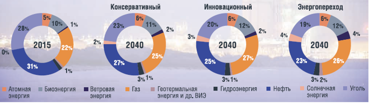 Рисунок 2.3 - Структура потребления первичной энергии по видам топлива в мире 2015 и 2040 гг.