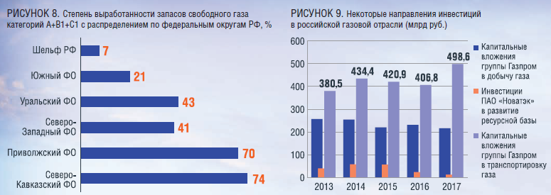 К основным проблемам отечественной газоперерабатывающей отрасли можно отнести: рост добычи газа в США, конкуренцию с другими странами в экспорте СПГ, стремление Европейского союза к энергонезависимости, устаревшее оборудование и технологии для транспортировки и переработки газа, отсутствие в достаточном количестве производств по выпуску продукции высоких переделов, проблемы производства и хранения гелия [10]. Одновременно газовая отрасль России сталкивается с такими проблемами, как падение добычи на зрелых месторождениях (рис. 2.8) [11] и стагнация (и даже снижение) инвестиций в газодобычу (рис. 2.9) [12]. Постепенное истощение рентабельных запасов газа в традиционных регионах, расположенных на суше, приведет к постепенному наращиванию объемов газодобычи в труднодоступных регионах (Ямал, Гыдан, Арктический шельф, Восточная Сибирь), где в последние годы создается новая инфраструктура для добычи и транспортировки газа.